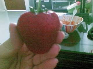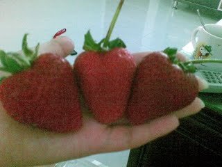 i dont know where the hell my father got these strawberries from. it is fucking big. and my big palm only can hold 3 of it. can you imagine how big the strawberries is, not only it is big. it is also very juicy and sweet.